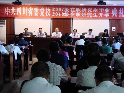 9月1日至15日,中共四川省委党校在职研究生2010级开学典礼暨2007级毕业典礼分别在省级机关、达州、攀枝花、遂宁、宜宾、乐山等17个分部教学点举行。出席开学典礼的校领导有:省委党校常务副校(院)长刘毅、副校(院)长郭伟、副校(院)长周治滨、副校(院)长尹科夫、副校(院)长李新、副校(院)长杨颖、教育长吴志强。