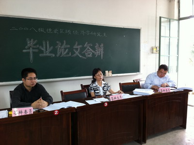 2008级德宏区域经济学专业在职研究生是我校研究生部与德宏州委干部教育委员会、德宏州委党校联合举办的第一届不脱产研究生。我校校委高度重视,研究生部坚持选用高素质、高水平、经验丰富的专家、教授对德宏学员进行讲学授课以及论文指导。经过三年的共同努力,德宏区域经济学在职研究生进入了最后的关键环节——毕业论文答辩。