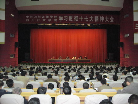 10月29日,校院召开职工学员大会,传达学习党的十七大精神和省九届三次全体(扩大)会议精神,安排部署校院学习贯彻十七大精神工作。常务副校(院)长刘毅主持会议并作讲话。副校(院)长郭伟、王福林、李新分别传达了十七大精神、温家宝总理参加四川代表团讨论时的重要讲话精神和省委九届三次全体(扩大)会议精神。校(院)委委员、秘书长邓荣杰,校(院)委委员、机关党委书记田丛松出席会议。