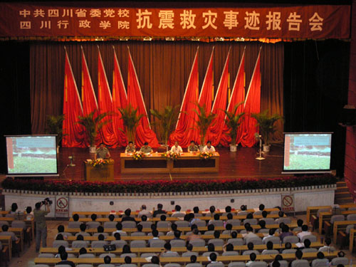 | 为学习抗震英雄,弘扬抗震精神,立足后方积极支援抗震救灾,切实发挥党校、行政学院作用,6月4日下午,机关党委在东校区大礼堂组织了一场生动的抗震救灾事迹报告会,邀请5位亲历抗震救灾一线的同志为校院教职工、离退休人员、主体班学员讲述他们在抗震救灾第一线的所见所闻和亲身感受。他们是:广元市利州区人民武装部部长陈礼富同志、内江市资中县人民武装部政治委员李文格同志、泸州市纳溪区人民武装部部长李华同志、眉山市丹棱县人民武装部部长陈于毅同志、中铁二局团委书记石庆鹏同志。报告会由校(院)委委员、机关党委书记田丛松同志主持。