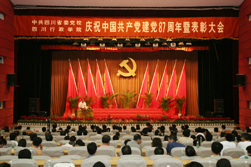 | 6月30日下午,校院庆祝中国共产党建党87周年暨表彰大会在东校区大礼堂隆重召开,常务副校院长刘毅同志代表校院委对校院全体共产党员致以了节日的问候,向在党旗下入党宣誓的新党员和受表彰的先进党组织和优秀党员、优秀党务工作者和优秀支部书记表示了热烈的祝贺,并在会上作了题为《弘扬抗震救灾精神 为党旗增辉》的重要讲话。会议由校(院)委委员、机关党委书记田丛松同志主持,全体校(院)委委员、在职厅级干部、教职工及学生党员近600人参加了会议。