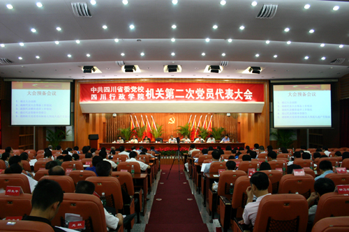 | 九月的校院,花团锦簇,丹桂飘香。2008年9月18日,校院机关第二次党员代表大会在蜀光大厦国际学术报告厅隆重召开。常务副校院长刘毅、副校院长李新、巡视员王福林、邓荣杰以及李锡炎、姜凌、谭辉章等校院老领导以代表身份出席会议,省直工委组织部副部长张志坚同志到会祝贺并宣读了《关于中共四川省委党校、四川行政学院召开机关第二次党员代表大会暨第二届机关党委委员委员候选人的批复》,153名党员代表参加了会议。校院委委员、机关党委书记田丛松同志主持大会并代表第一届机关党委向大会作了工作报告,常务副校院长刘毅同志代表校院委作了讲话。