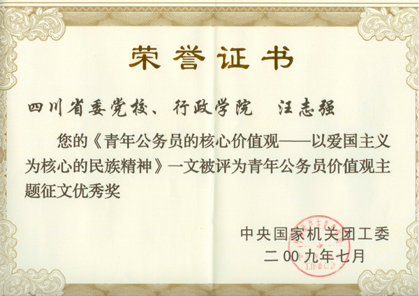 为更好地引导青年公务员树立正确的价值观,不断探索和总结机关共青团工作和青年公务员的成长规律,今年上半年,中央国家机关团工委在全国各省、市、区直机关团工委、副省级城市市直机关团工委和中央国家机关各部门机关团委中开展了青年公务员价值观征文活动,经校院团委组织,省直团工委评选推荐,我校院教务处青年教师汪志强同志撰写的《青年公务员的核心价值观——以爱国主义为核心的民族精神》荣获优秀奖。