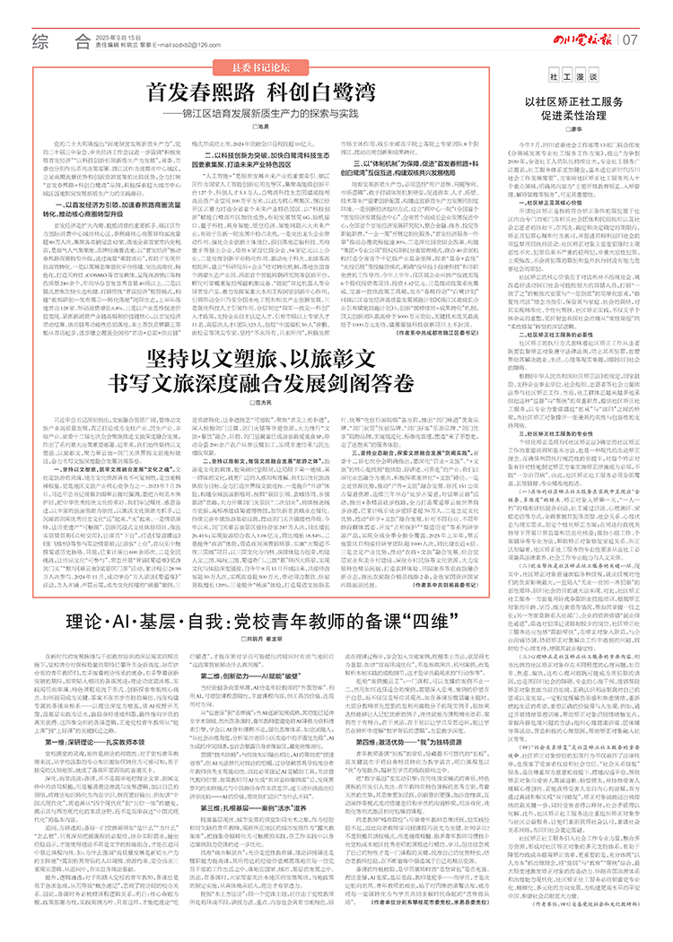 三、坚持业态融合,探索文旅融合发展“剑阁实践”。省委十二届七次全会明确指出,要深化“百业+文旅”。“+文旅”的核心是找到“能体验、好讲述、可带走”的产业。我们以深化业态融合为重点,积极探索差异化“+文旅”路径。一是立足资源优势,推动“户外+文旅”融合发展。依托151公里古蜀道资源,连续三年举办“徒步古蜀道,对话翠云廊”活动,推出4条精品徒步线路,全力打造蜀道翠云廊世界级步游道,已累计吸引徒步爱好者超70万人。二是立足文化优势,推动“研学+文旅”融合发展。针对不同行业、不同年龄段群体需要,开发“古柏保护”“蜀道历史”等系列研学游产品,实现全域全季全龄全覆盖。2025年上半年,翠云廊景区日均接待研学团队超1000人次,同比增长近6倍。三是立足产业优势,推动“农商+文旅”融合发展。结合宜居宜业和美乡村建设,深挖乡村民俗等文化资源,大力发展特色精品民宿,打造农耕体验、田园康养等农商旅融合新业态,推出农旅融合精品线路2条,金色家园获评国家丙级旅游民宿。 (作者系中共剑阁县委书记)