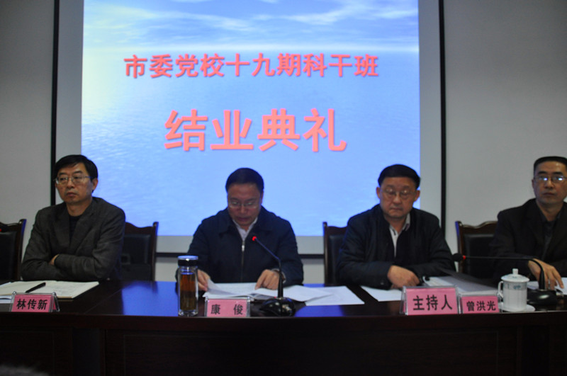 11月7日上午,市委常委、组织部部长、党校校长康俊出席市委党校第5期中青年干部培训班座谈会和第19期科干班结业典礼。市委党校(行政学院、社会主义学院)党委书记、常务副校(院)长曾洪光主持了座谈会和结业典礼。