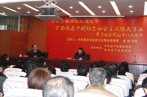 12月21日,由遂宁市委组织部、市委党校主办的第三期“中国高端讲坛走进遂宁”大型报告会在市委党校举行。中央党校马克思主义理论教研部副主任、教授、博士生导师秦刚应邀作了《全面推进中国特色社会主义伟大事业——学习领会党的十八大精神》的专题报告。市县级干部学习贯彻党的十八大精神专题班、第九期科级干部自主选学培训班、优秀大学生村官培训班学员共700余人聆听报告。