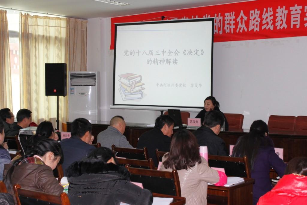 通过集中专题讲座,全校职工进一步提升了对改革的认识,对十八届三中全会决定有了更深刻的理解,开阔了思路,在学习贯彻党的群众路线教育实践活动中,努力做到自我净化、自我完善、自我革新、自我提高。