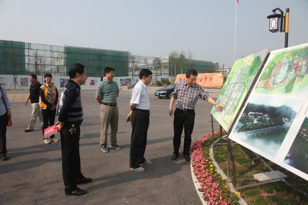 蒙校长(右一)在为丁主任(右二)一行介绍校园发展规划图