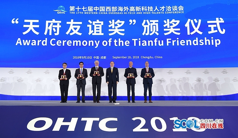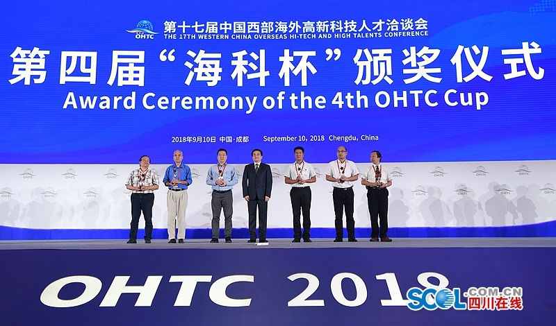 开幕式上还举行了颁奖仪式。尹力向为四川经济社会发展作出重要贡献的5名外国专家颁发2018年度“天府友谊奖”;邓小刚为第四届“海科杯”全球华侨华人创新创业大赛获奖者颁奖。