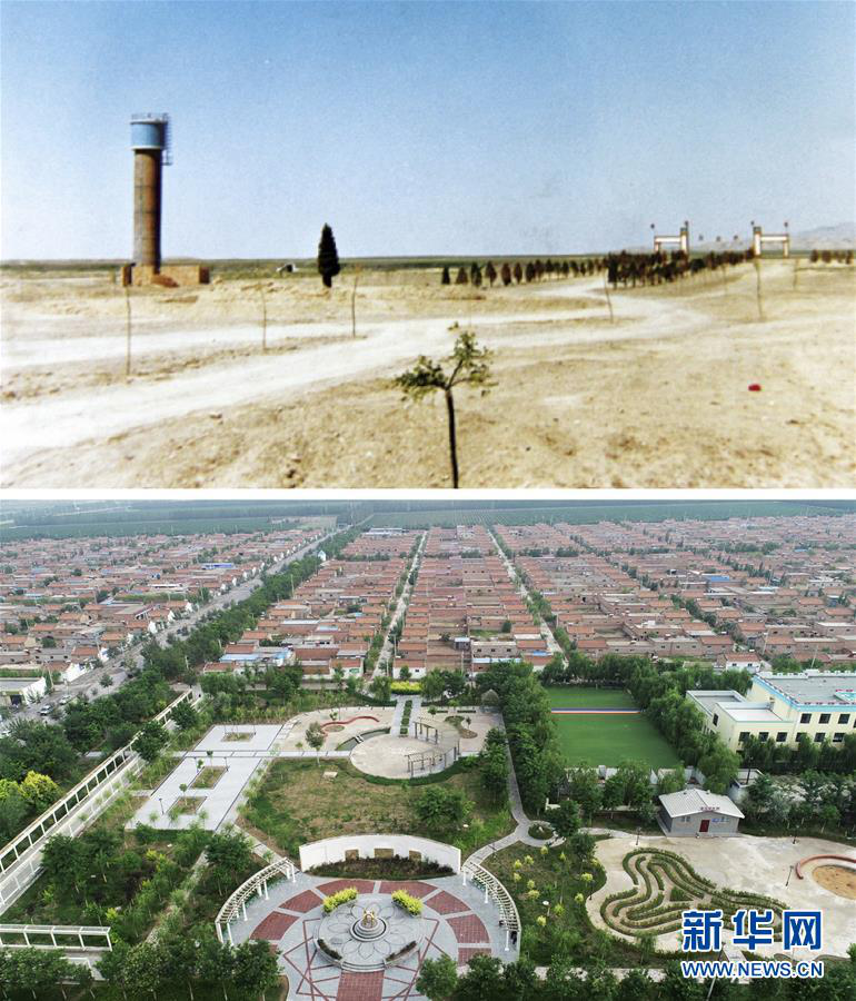 拼版照片:上图为宁夏银川市永宁县闽宁镇建设初期的资料照片;下图为8月17日无人机拍摄的宁夏银川市永宁县闽宁镇原隆村(新华社记者王鹏摄)。受益于福建、宁夏多层次、多形式、宽领域、全方位的扶贫协作,闽宁镇这片曾经的戈壁荒滩,被建设成现代化的生态移民示范镇。6万多名曾经生活在西海固贫困山区的农民陆续走出大山搬入闽宁镇,通过移民搬迁走上了脱贫致富之路。 新华社发