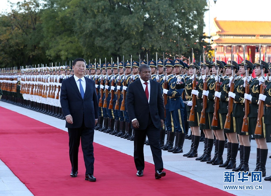 10月9日,国家主席习近平在北京人民大会堂同安哥拉总统洛伦索举行会谈。这是会谈前,习近平在人民大会堂东门外广场为洛伦索举行欢迎仪式。 新华社记者刘卫兵摄