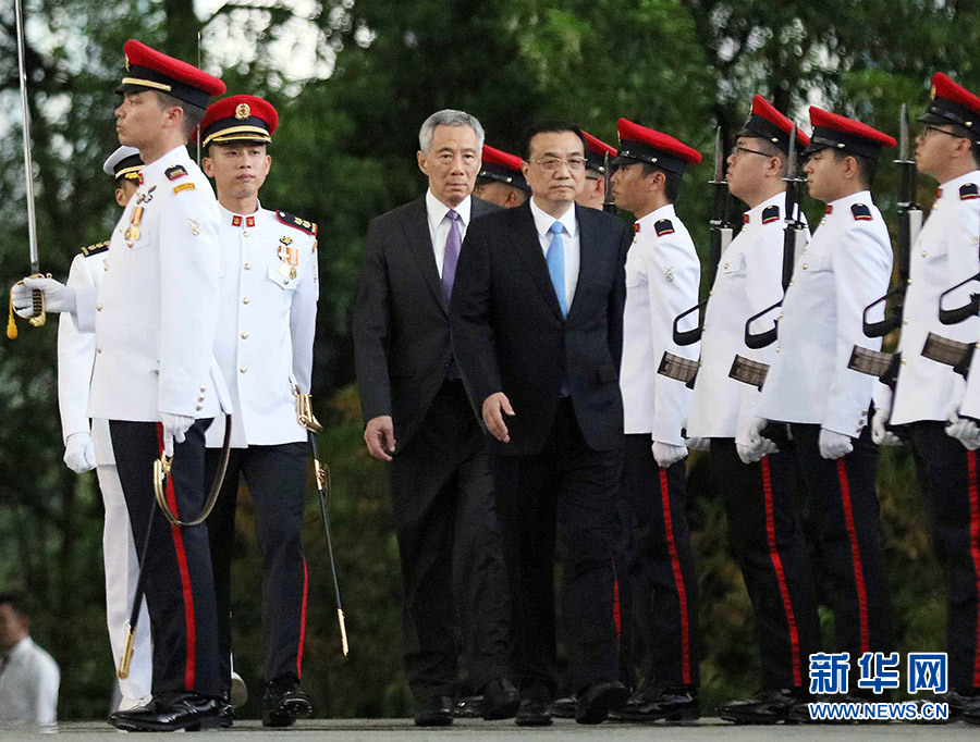 当地时间11月12日下午,国务院总理李克强在新加坡总统府同新加坡总理李显龙举行会谈。这是会谈前,李显龙在总统府广场为李克强举行隆重的欢迎仪式。 新华社记者 刘卫兵 摄