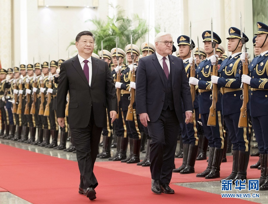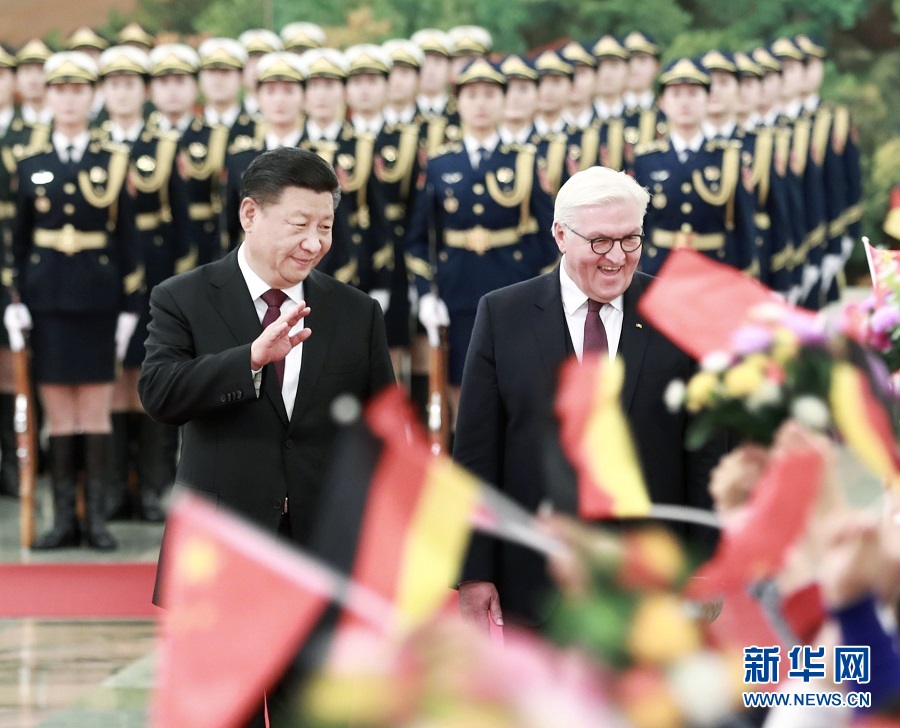 12月10日,国家主席习近平在北京人民大会堂同德国总统施泰因迈尔举行会谈。这是会谈前,习近平在人民大会堂北大厅为施泰因迈尔举行欢迎仪式。 新华社记者 王晔 摄