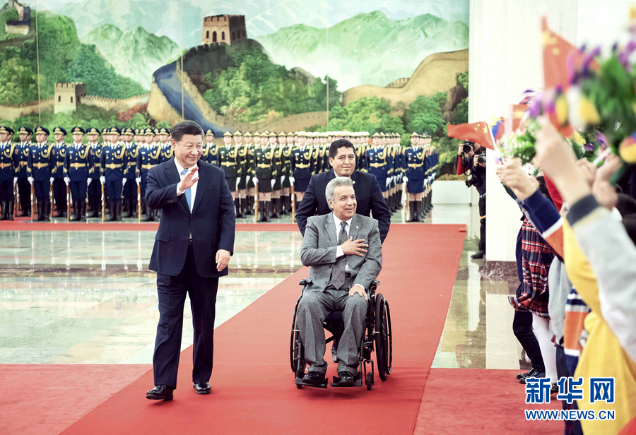 12月12日,国家主席习近平在北京人民大会堂同厄瓜多尔总统莫雷诺举行会谈。这是会谈前,习近平在人民大会堂北大厅为莫雷诺举行欢迎仪式。 新华社记者 李涛 摄