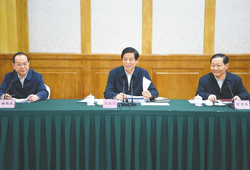 4月8日至11日,中共中央政治局常委、全国人大常委会委员长栗战书率领全国人大常委会执法检查组在四川检查水污染防治法实施情况。这是4月10日,栗战书在省人大常委会机关主持会议同地方人大负责同志和部分全国人大代表、地方各级人大代表座谈。新华社记者 燕雁 摄
