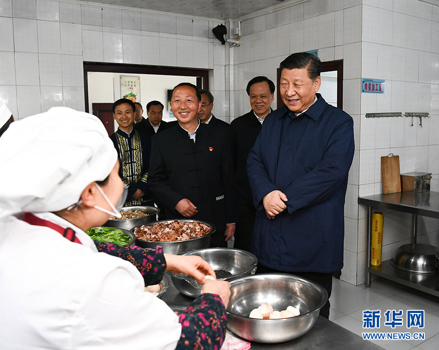 4月15日,中共中央总书记、国家主席、中央军委主席习近平在重庆考察调研。这是习近平在石柱土家族自治县中益乡小学学生食堂了解陪餐情况。 新华社记者 鞠鹏 摄