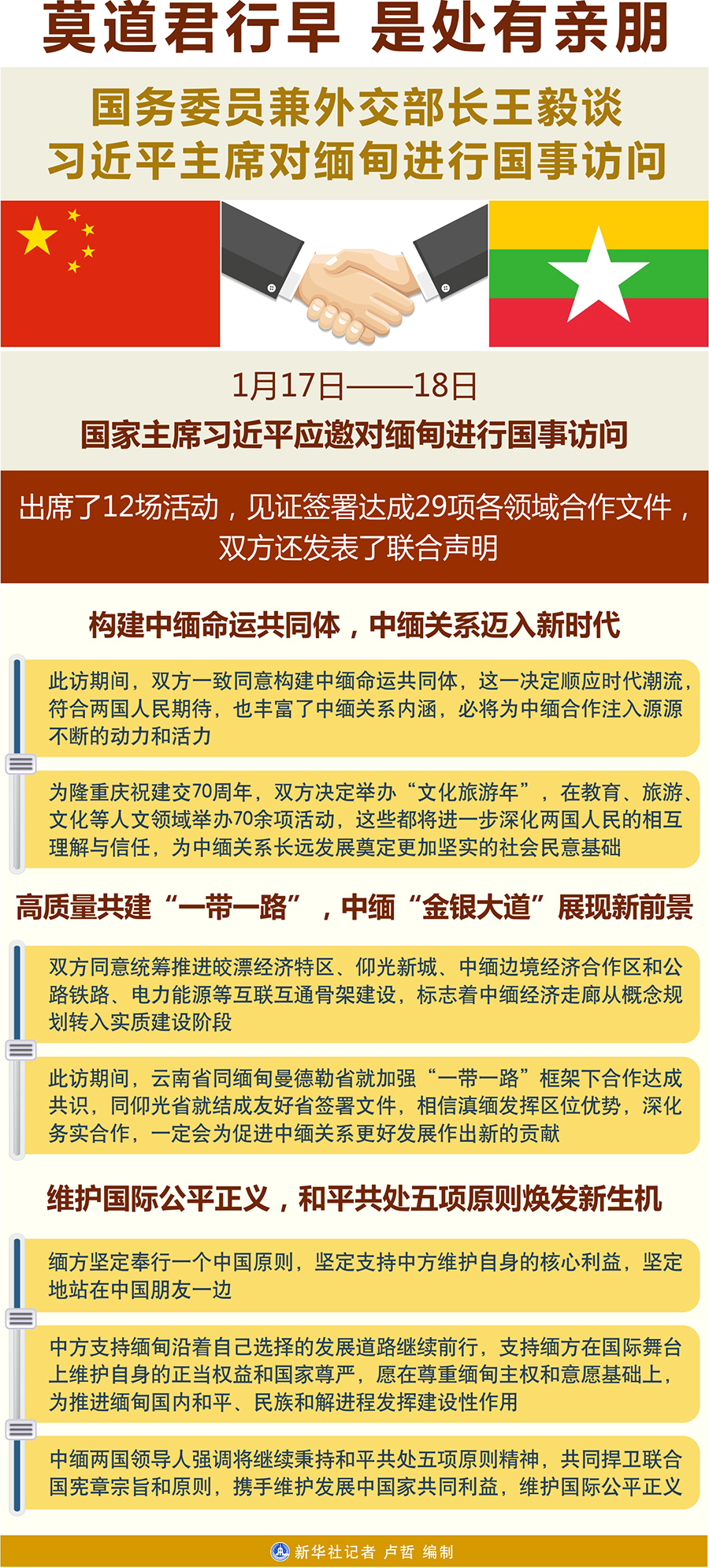新华社内比都1月18日电 1月17日至18日,国家主席习近平应邀对缅甸进行国事访问。行程结束之际,国务委员兼外交部长王毅向随行记者介绍此访情况。