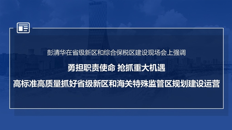 彭清华在讲话中指出,今年1月,习近平总书记、党中央决定把推进成渝地区双城经济圈建设作为国家战略,明确要求支持成渝地区探索经济区和行政区适度分离,为我们规划建设省级新区提供了重要遵循。省委、省政府认真落实习近平总书记重要讲话精神和党中央决策部署,决定重点在经济发展水平和基础条件相对较好的区域中心城市,根据实际需要,适度有序布局省级新区,形成优势互补高质量发展的区域经济增长极和动力源。这是事关四川发展长远和全局的重大战略部署,有利于全面贯彻新发展理念,扎实推进成渝地区双城经济圈建设,深入实施“一干多支、五区协同”战略部署,加快打造现代化新城和全省经济副中心;有利于建设高水平开发开放平台,加快打造科技创新中心和内陆开放经济高地,形成“四向拓展、全域开放”立体全面开放新态势;有利于践行以人民为中心的发展思想,促进产业与城市融合发展、人口与产业协同集聚,加快打造高品质生活宜居地,更好满足人民群众对美好生活的需要。海关特殊监管区是我国开放型经济发展的先行区和加工贸易转型升级的集聚区,为承接国际产业转移、吸引国外投资、拉动外贸出口发挥了重要作用。去年12月,国家批准我省3个综合保税区和1个保税物流中心(B型),充分体现了党中央、国务院对四川改革发展的高度重视和关心关怀,为我省进一步提高对外开放合作层次和水平,引进更多外向型重大项目和高端资源要素,推动贸易和投资自由化便利化,大力发展新模式新技术新产业,加快打造改革开放新高地注入了强劲动能。