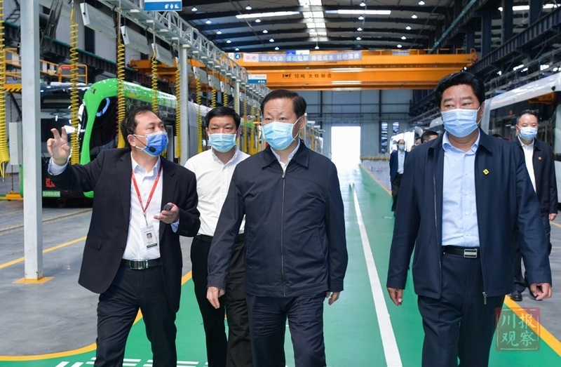 4月26日,省委书记彭清华到宜宾三江新区中车铁投轨道交通产业基地调研,了解智能无轨列车生产和市场销售情况。