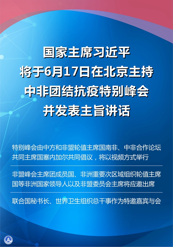 特别峰会由中方和非盟轮值主席国南非、中非合作论坛共同主席国塞内加尔共同倡议,将以视频方式举行。非盟峰会主席团成员国、非洲重要次区域组织轮值主席国等非洲国家领导人以及非盟委员会主席将应邀出席。联合国秘书长、世界卫生组织总干事作为特邀嘉宾与会。