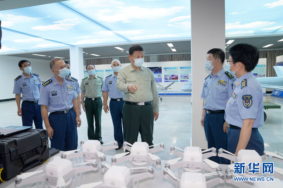 八一建军节到来之际,中共中央总书记、国家主席、中央军委主席习近平7月23日到空军航空大学视察,代表党中央和中央军委,向学校师生员工致以诚挚问候,向全体人民解放军指战员、武警部队官兵、民兵预备役人员致以节日祝贺。这是习近平察看无人机操控教学设施,了解无人机操控员培养情况。 新华社记者 李刚 摄
