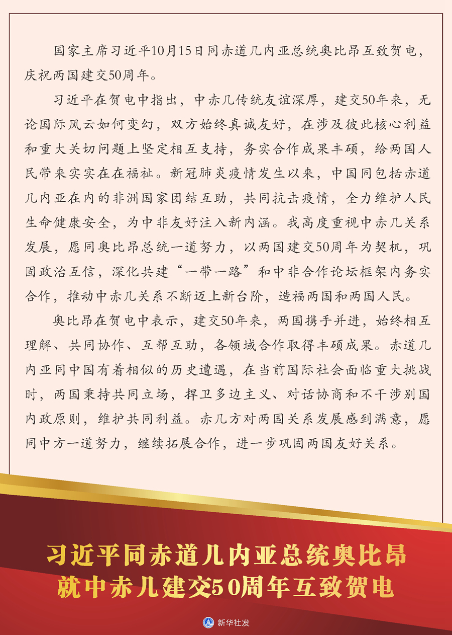 新华社北京10月15日电 国家主席习近平10月15日同赤道几内亚总统奥比昂互致贺电,庆祝两国建交50周年。