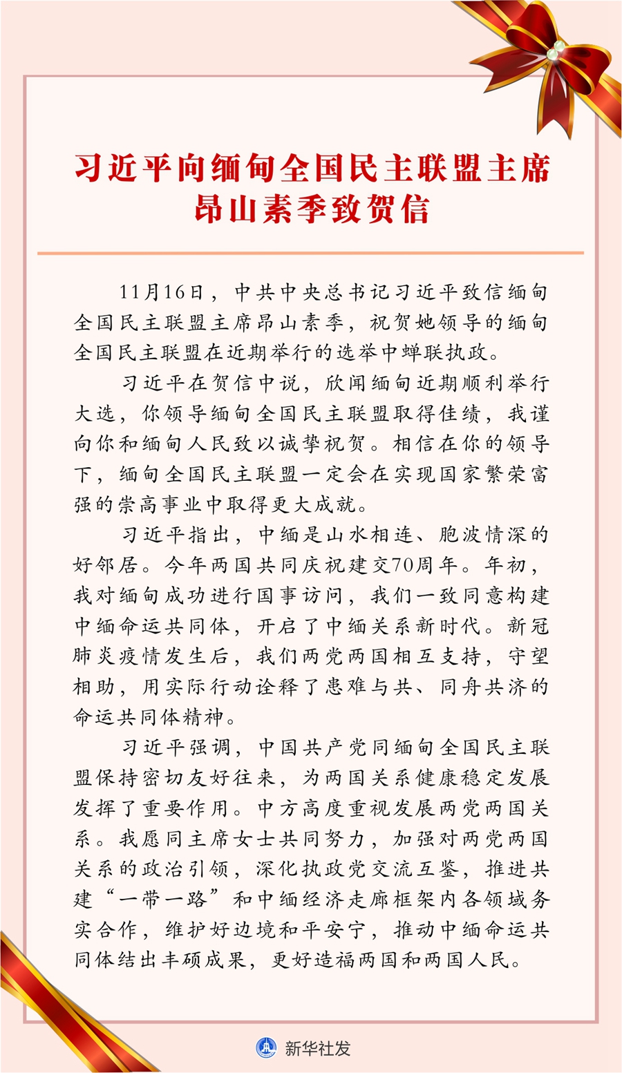 习近平在贺信中说,欣闻缅甸近期顺利举行大选,你领导缅甸全国民主联盟取得佳绩,我谨向你和缅甸人民致以诚挚祝贺。相信在你的领导下,缅甸全国民主联盟一定会在实现国家繁荣富强的崇高事业中取得更大成就。