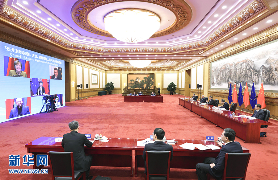 12月30日晚,国家主席习近平在北京同德国总理默克尔、法国总统马克龙、欧洲理事会主席米歇尔、欧盟委员会主席冯德莱恩举行视频会晤。中欧领导人共同宣布如期完成中欧投资协定谈判。 新华社记者 丁林 摄