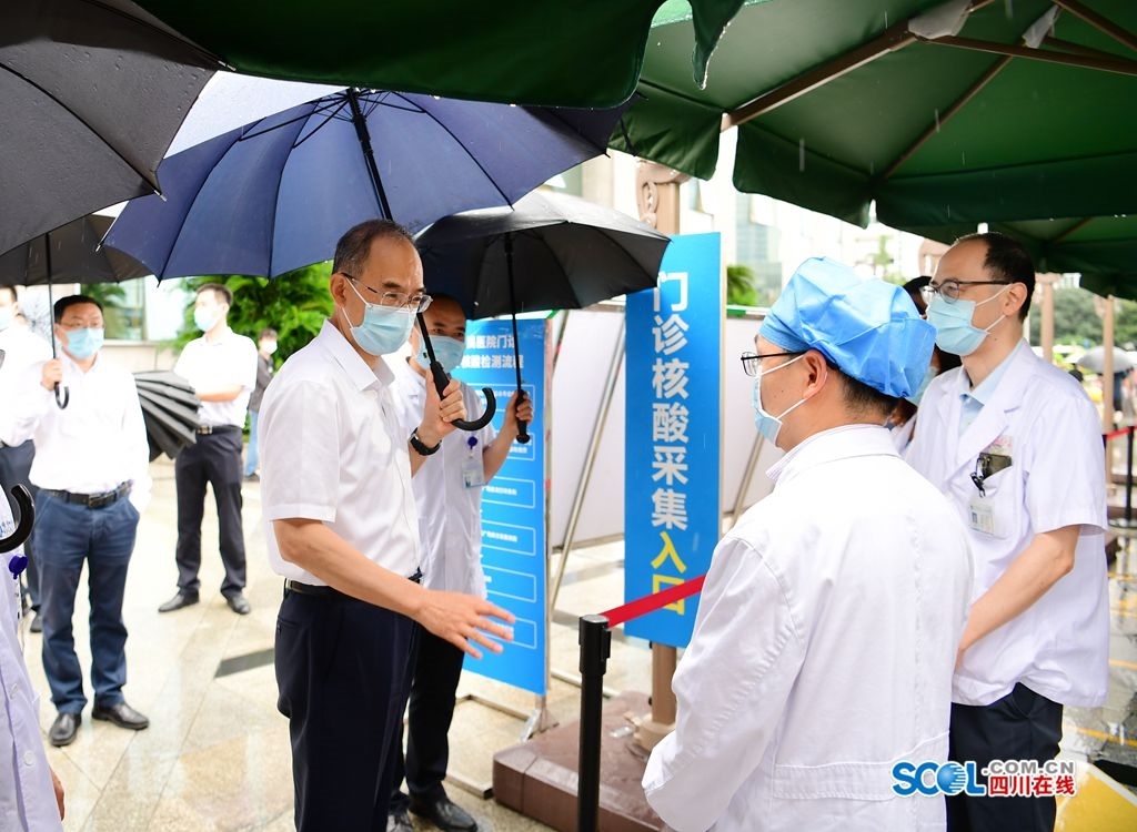 8月18日,省委副书记、省长黄强来到省人民医院发热门诊核酸检测点,向不久前发现成都本土首例确诊病例的医务人员表示感谢和问候。