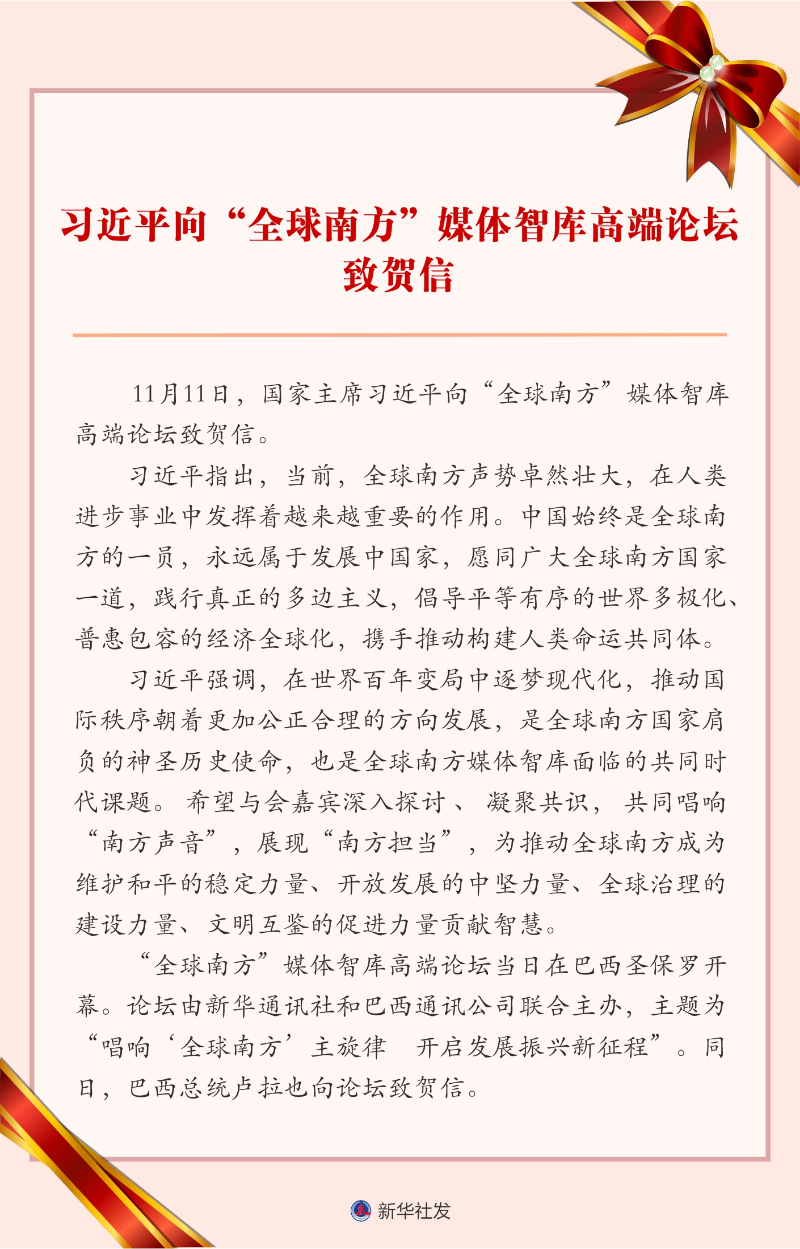 新华社北京11月11日电 11月11日,国家主席习近平向“全球南方”媒体智库高端论坛致贺信。