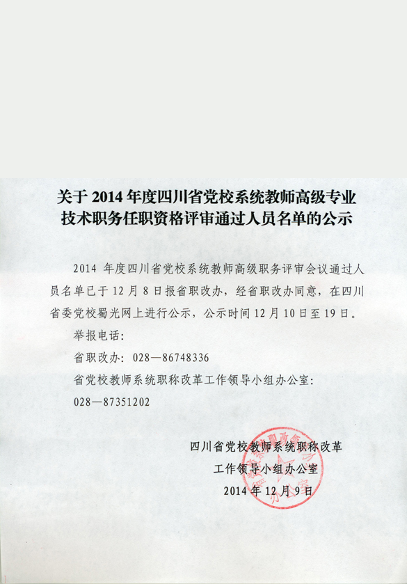 关于2014年度四川省党校系统教师高级专业技术职务任职资格评审通过人员名单的公示