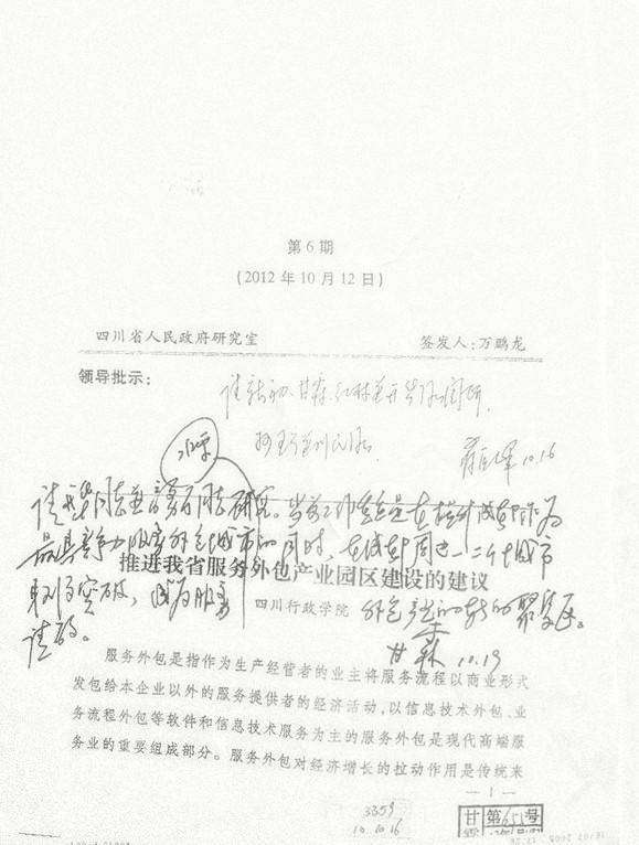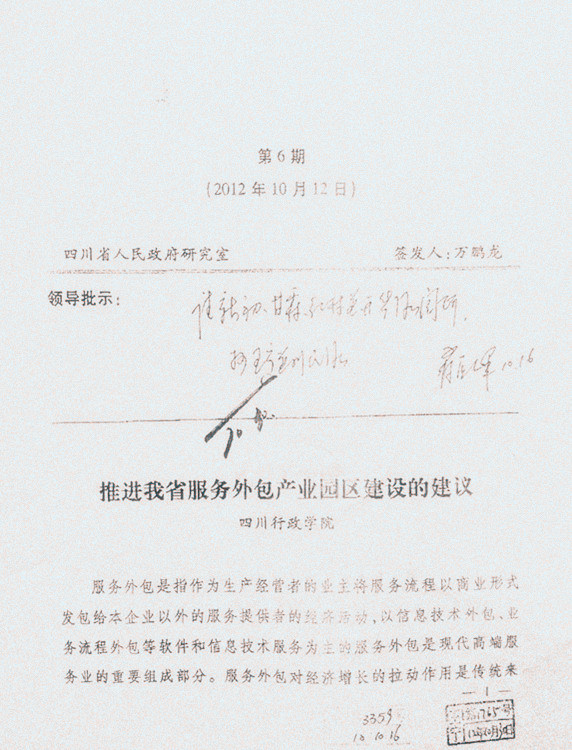 蒋巨峰省长10月16日在调研报告上批示:请新初、甘霖、红林并开华同志阅研,抄王宁并利民同志。王宁同志10月30日圈阅。甘霖同志10月19日批示:请开华同志并商务厅同志研究。当前工作重点是在提升成都作为最具竞争力服务外包城市水平的同时,在成都周边一、二个城市取得突破,成为服务外包产业的新的聚集区。请酌。