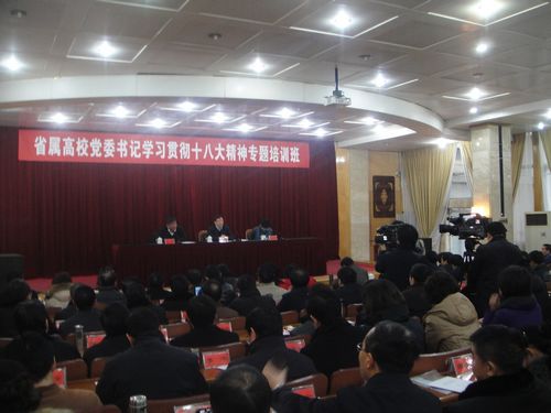 1月14日上午,由省委组织部、省委教育工作委员会、省委党校共同举办的省属高校党委书记学习贯彻十八大精神专题培训班在我校学术报告厅举行开学典礼。来自省属高校的94名党委书记将集中开展两天的十八大精神专题学习培训。
