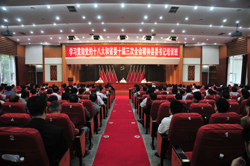 9月8日上午,为期4天半 “学习贯彻党的十八大和省委十届三次全会精神县委书记培训班”在我校圆满结束。省委常委、组织部部长范锐平出席县委书记培训班结业仪式,强调县委书记要深入学习领会党的十八大精神和省委十届三次全会战略部署,自觉践行群众路线,认真做好群众工作,以党心民心的极大凝聚,推动形成县域经济发展的强大正能量。省委党校常务副校长刘毅出席结业仪式。省委组织部副部长蒲波主持结业仪式。参加培训的全省县(市、区)委书记参加结业仪式,来自乐山、雅安、甘孜等7位县委书记代表学员作了学习总结发言。