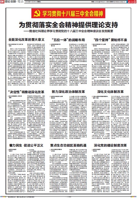 11月29日,《四川日报》以《为贯彻落实全会精神提供理论支持》为题,用一个整版(第6版)集中刊发全省社科理论界学习贯彻党的十八届三中全会精神座谈会发言摘要。此次共刊发包括校院周治滨、张星炜、李翔宇等9位专家的发言摘要。校院发言专家数量是全省社科研究机构、高校中最多的。
