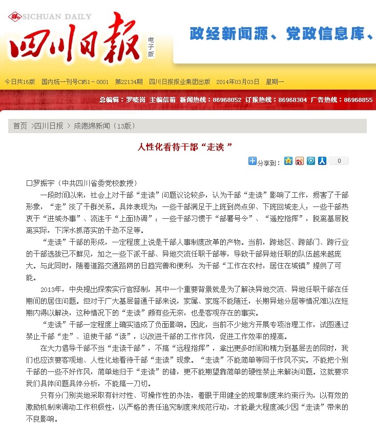 2014年3月3日,《四川日报》成德绵新闻专版刊登校院专家罗振宇教授评论文章《人性化看待干部“走读”》。