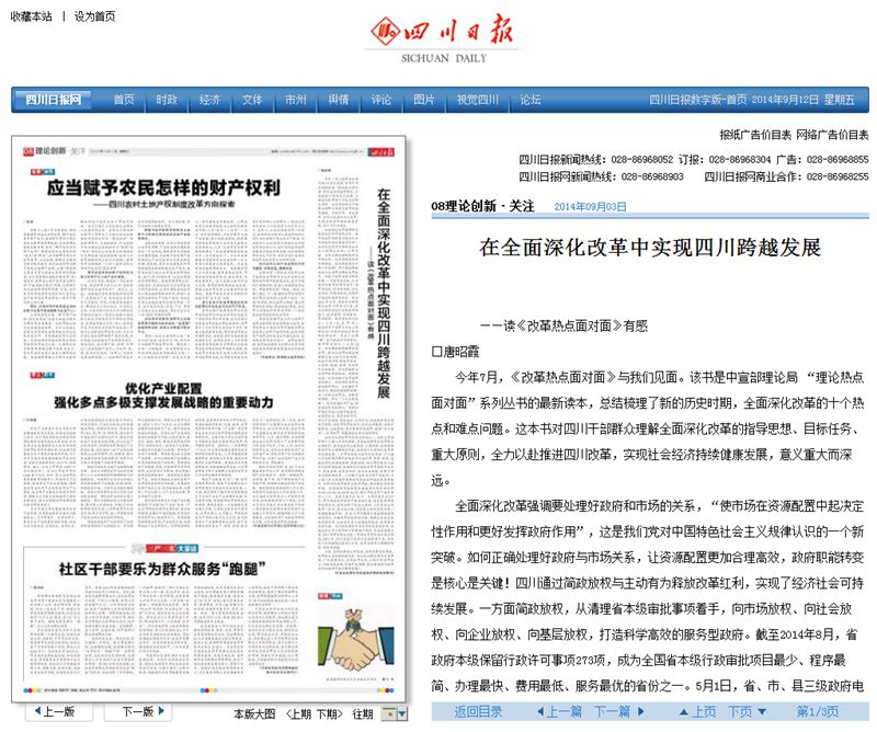 9月3日,《四川日报》刊登区域经济教研部唐昭霞副教授理论文章《在全面深化改革中实现四川跨越发展》。