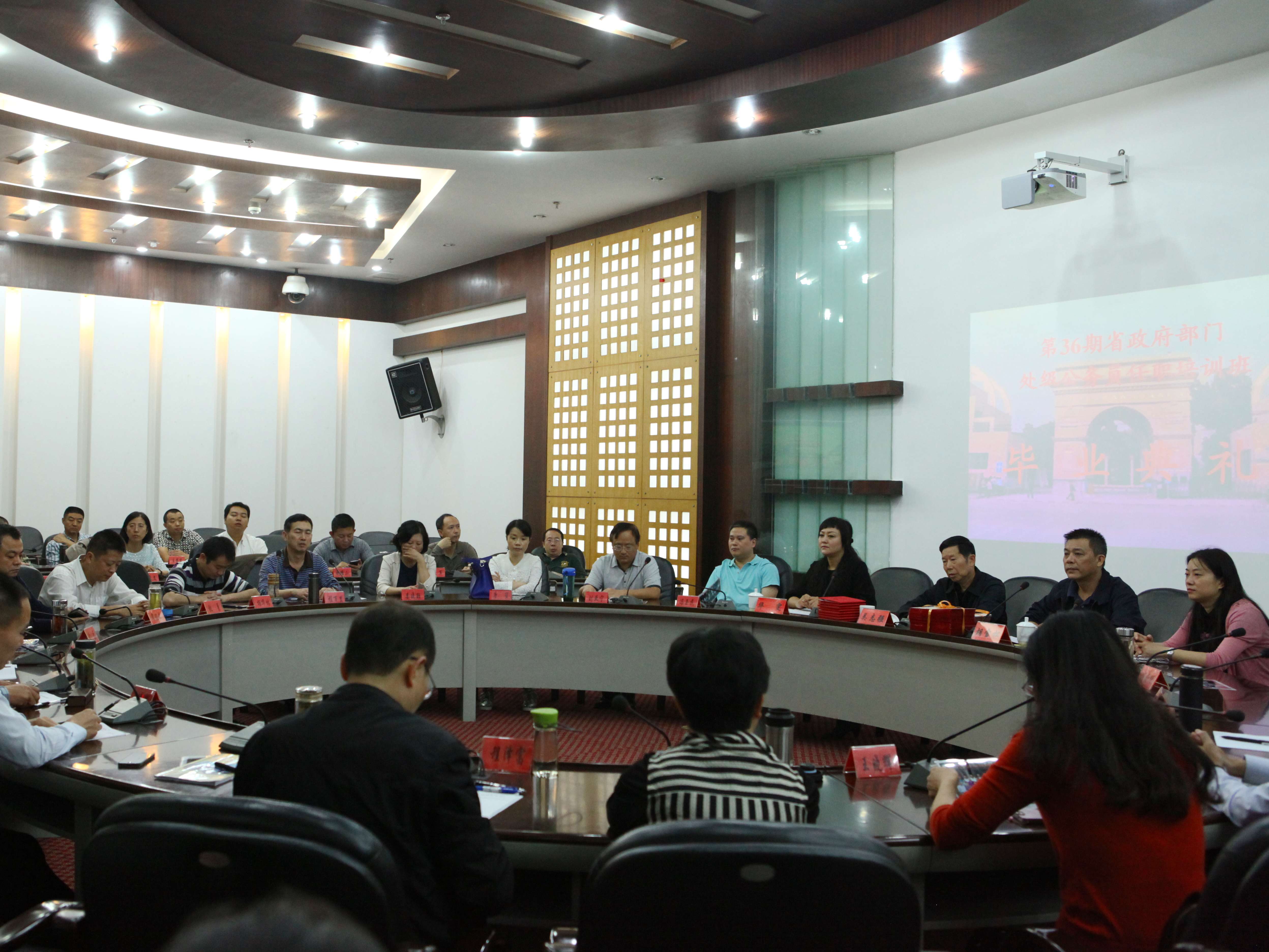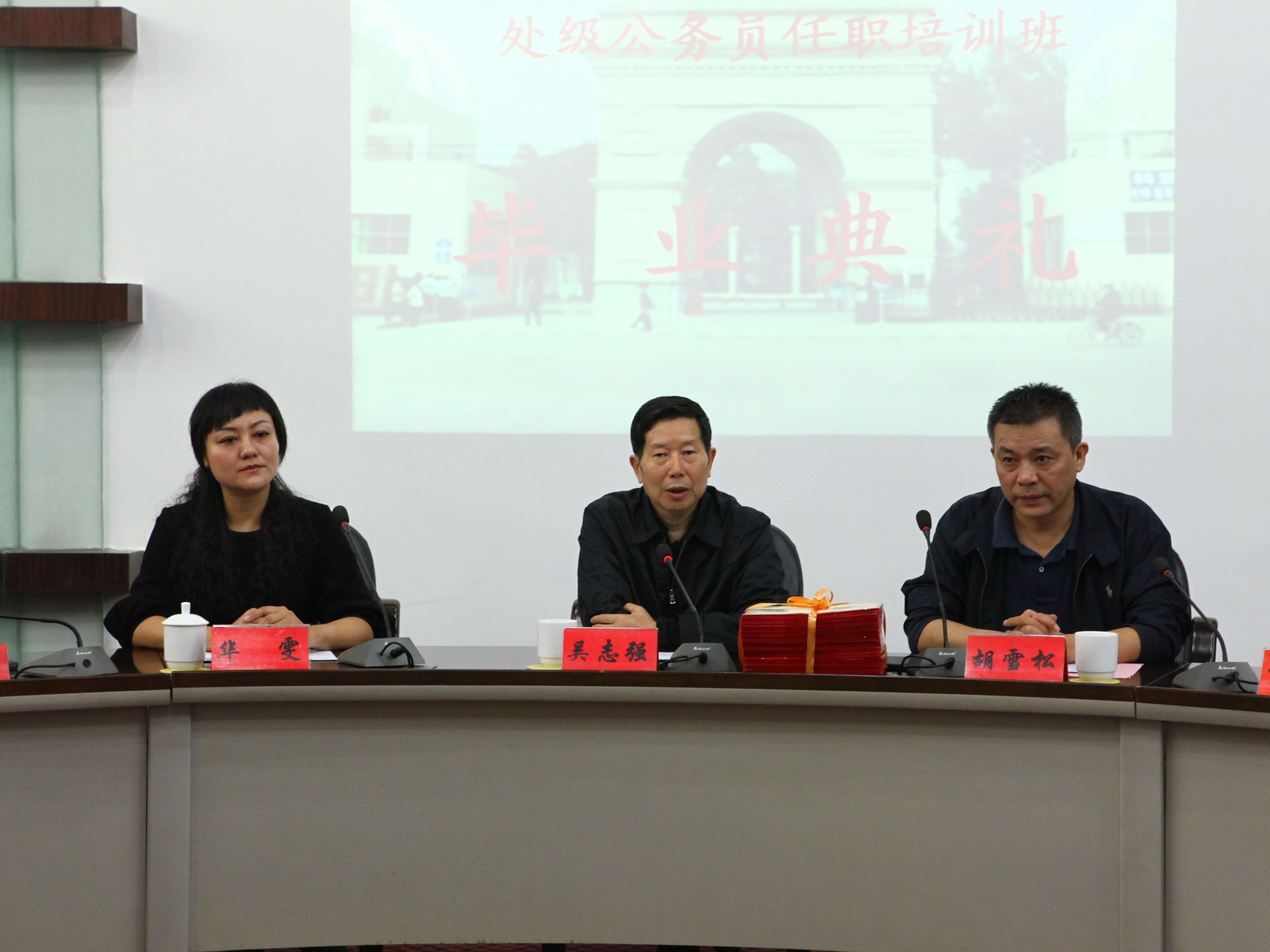 10月15日,第36期省政府部门处级公务员任职培训班毕业典礼在圆桌会议厅进行。四川行政学院教育长吴志强出席并讲话。培训部主任胡雪松主持开学典礼。
