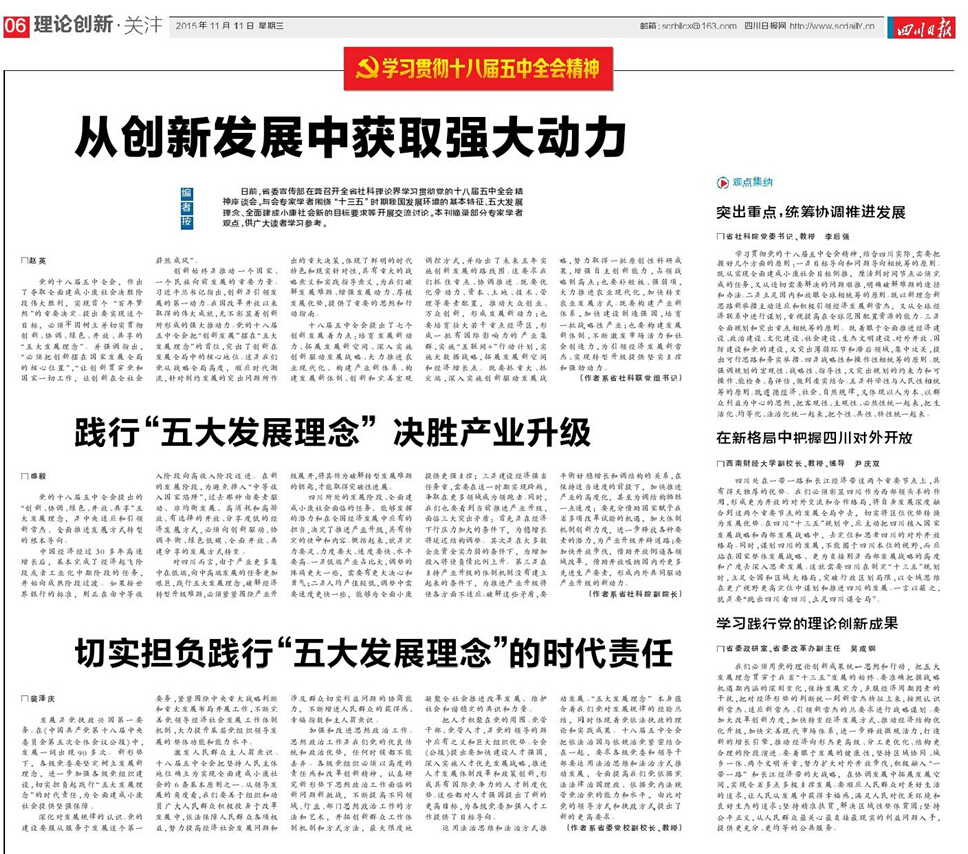 11月11日,《四川日报》理论创新版(06版)“学习贯彻十八届五中全会精神”专栏,刊发副校院长裴泽庆教授的理论文章《切实担负践行“五大发展理念”的时代责任》。