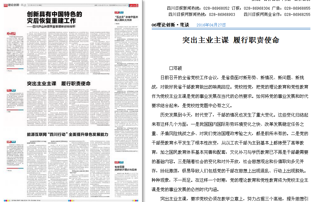 4月27日,《四川日报》理论创新版刊发副校院长邓颖同志学习贯彻全省党校工作会议精神理论文章《突出主业主课,履行职责使命》。