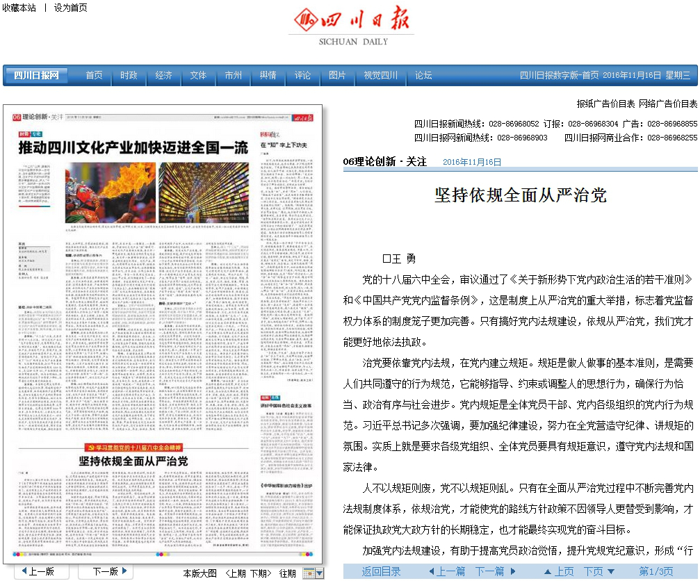 11月16日,《四川日报》理论创新版刊载副校院长王勇理论文章《坚持依规全面从严治党》。