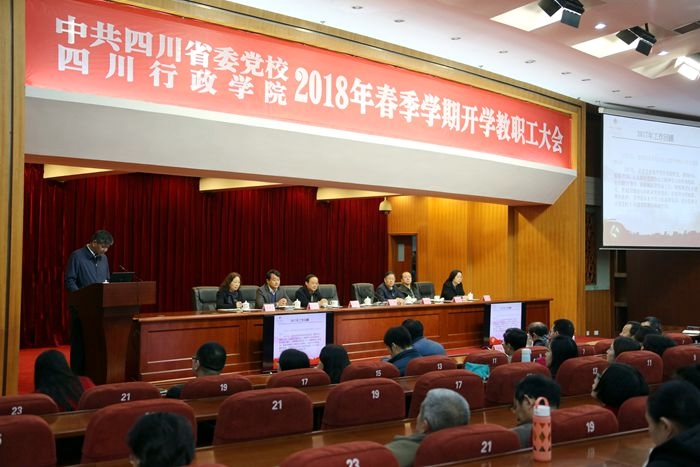 3月2日,校院在蜀光大厦国际学术演讲厅召开2018年春季学期开学教职工大会。常务副校院长李新代表校院委回顾2017年工作、安排2018年任务,副校院长李章忠主持会议,校院委委员、在职厅级干部、离退休党总支正副书记出席会议。
