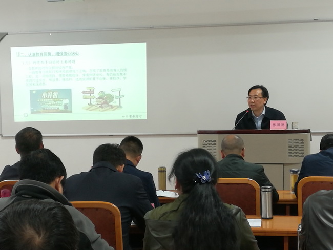 张澜涛从“优先发展教育 引领中国未来”、“认清教育形势 增强信心决心”、“顺应时代洪流 把握发展机遇”、“明确发展目标 深化教育改革”、“攻坚克难担当 打赢教育脱贫攻坚”、“当好总指挥 念好教育经”六个方面,深入浅出地讲解了国际国内的教育形势、国家当前教育的方针政策和改革发展状况、四川的教育现状及存在问题与对策。特别是针对四川深度贫困地区的教育扶贫,在深度贫困地区脱贫过程中如何抓好民族不发达地区的教育等等,都提出了很多很好的建议意见。张澜涛还与来自深度贫困地区的学员们进行了沟通和交流,让大家感到受益匪浅。