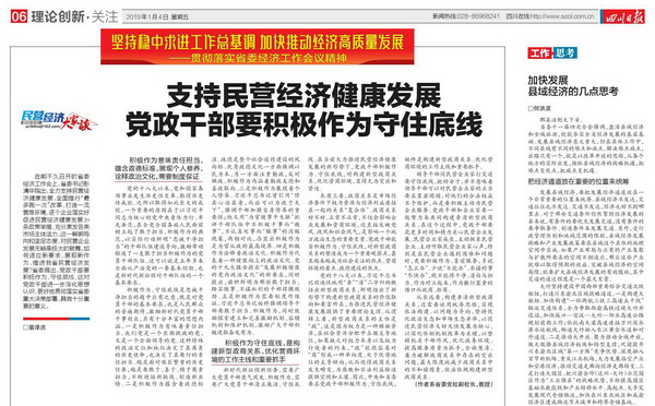 1月4日,《四川日报》(06版,理论创新*关注栏目)登载了副校院长裴泽庆教授的理论文章《支持民营经济健康发展 党政干部要积极作为守住底线》。