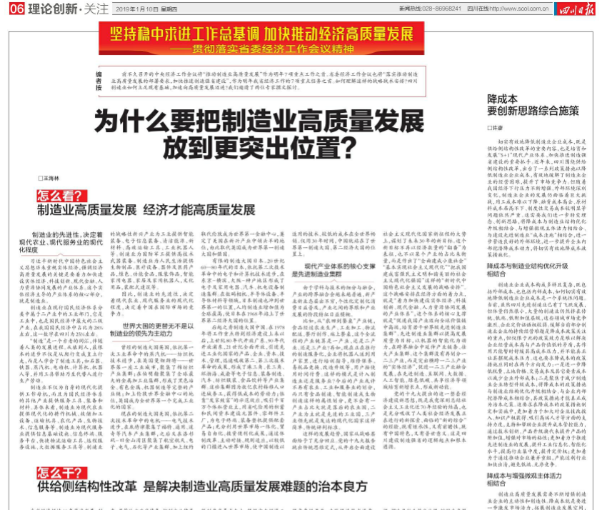 1月10日,《四川日报》(06版,理论创新.关注)刊登我校经济学教研部主任许彦教授的理论文章《降成本 要创新思路综合施策》。