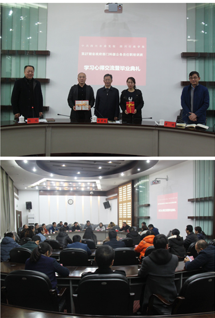 12月17上午,第27期省政府部门科级公务员任职培训班举行学习心得交流暨毕业典礼。副校(院)长李章忠出席并讲话,培训部主任曾琦宣读优秀学员表彰决定,培训部党总支书记张阁主持会议。