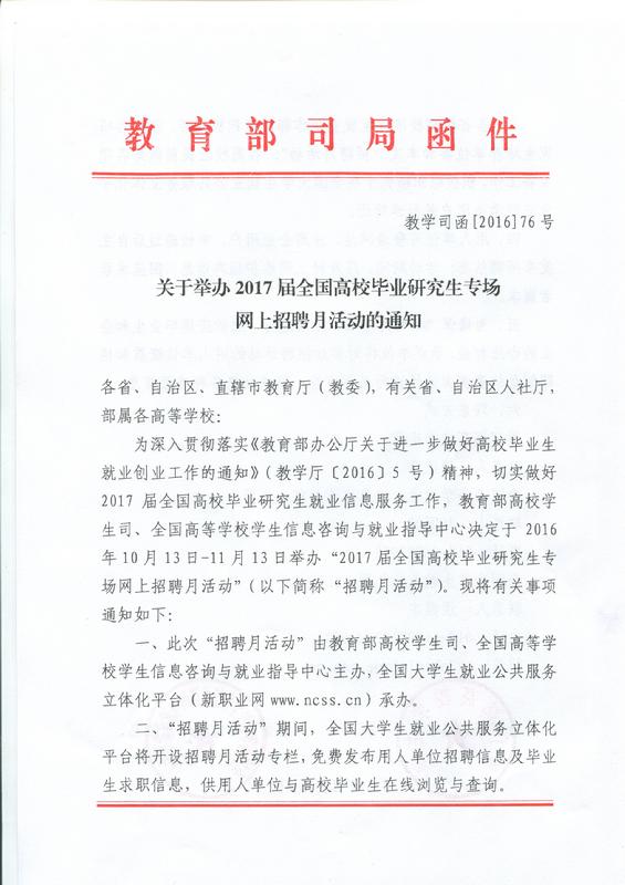 关于举办2017届全国高校毕业生研究生专场网上招聘月活动的通知