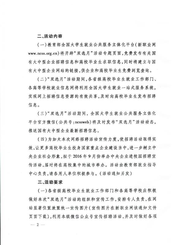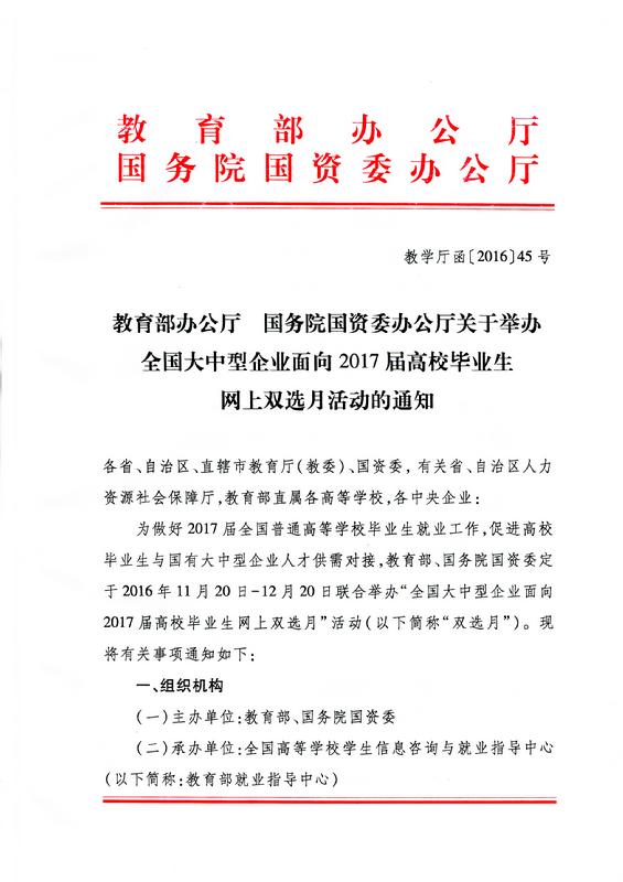 教育部办公厅国务院国资委办公厅关于举办大中型企业面向2017届高校毕业生网上双选月活动的通知