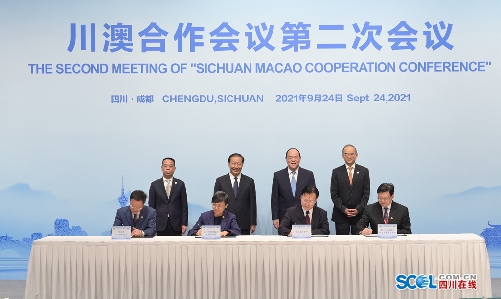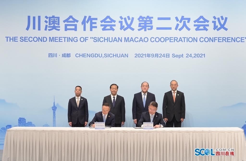 9月24日下午,川澳合作会议第二次会议在成都召开,四川省人民政府与澳门特别行政区政府签署会议纪要和有关重点领域合作备忘录。省委书记彭清华、澳门特别行政区行政长官贺一诚、国务院港澳办副主任黄柳权出席会议并致辞,共同见证会议纪要和协议签署。省委副书记、省长黄强主持会议,省委副书记邓小刚出席。