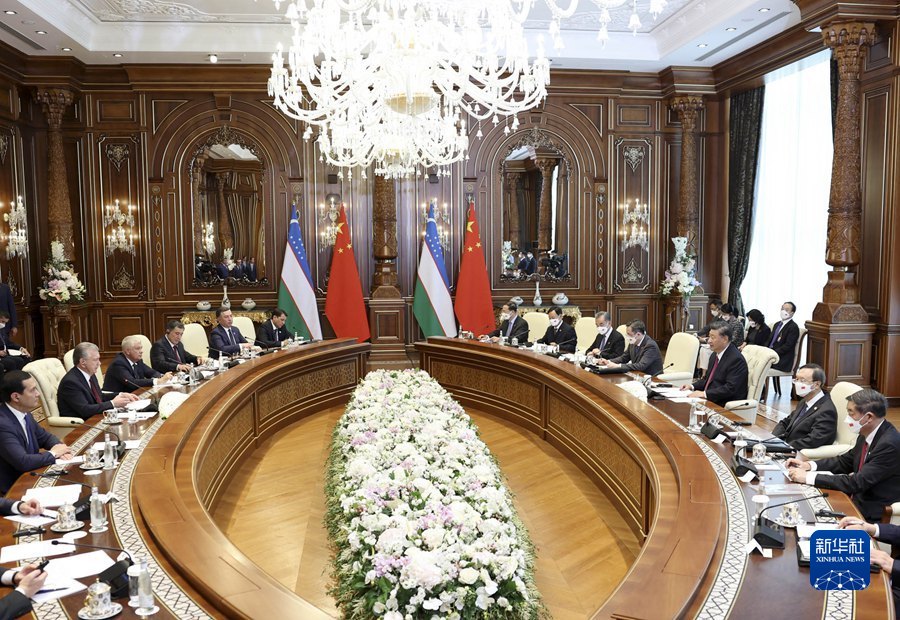 习近平指出,中国同中亚国家是唇齿相依、安危与共的命运共同体。中方愿同乌方加强合作,坚决反对外部势力干涉内政,坚定维护各自国内稳定,坚定维护地区安全利益。中方赞赏乌方为成功举办上海合作组织撒马尔罕峰会作出的重要贡献,愿同乌方携手推动本组织发展行稳致远。中方愿同乌方等地区国家一道,做大做强“中国+中亚五国”会晤机制,为中国同中亚国家合作开辟新的广阔空间。中方愿同乌方积极落实全球发展倡议和全球安全倡议,维护发展中国家共同利益,为推动构建更加公正合理的全球治理体系作出贡献。